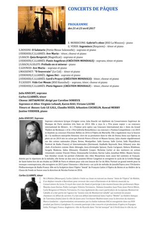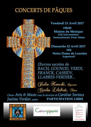Le document présente le programme des concerts de Pâques des 21 et 23 avril 2017, mettant en avant des œuvres classiques interprétées par le chœur Arts&Music, dirigé par Caroline Sorieux, avec des solistes comme Julia Knecht et Carlos Llabrés. Il décrit également les parcours des artistes et la création de l'opéra 'Gradiva' par Justine Verdier et Carlos Llabrés, ainsi que les performances à venir. Les concerts incluent des œuvres de compositeurs renommés et un répertoire varié, alliant musique classique et contemporaine.
