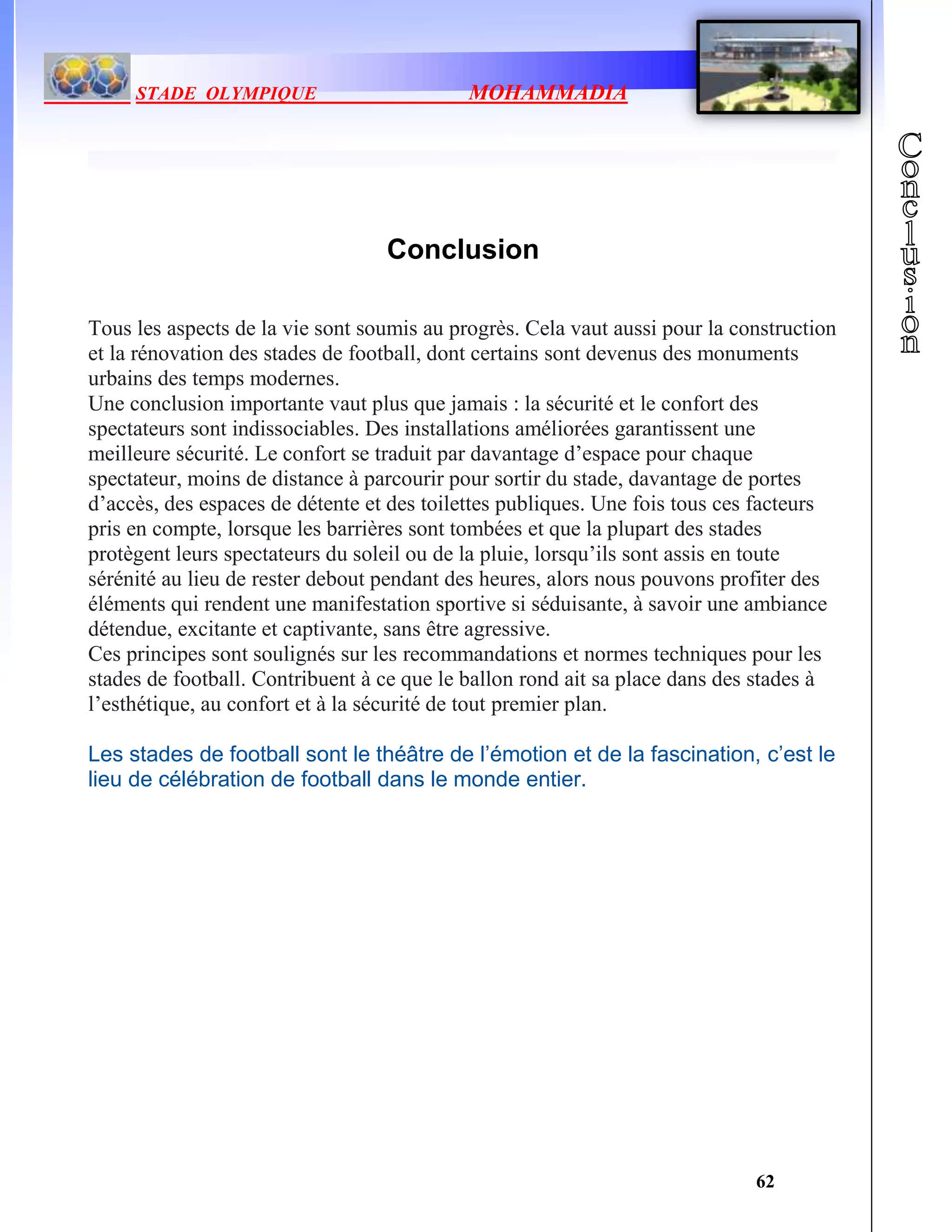 Le stade olympique de Mohammadia, d'une capacité de 50 000 places, reflète l'évolution des stades de football en mettant l'accent sur la sécurité et le confort des spectateurs. Des installations modernisées améliorent l'expérience, offrant plus d'espace et d'accès. Ces éléments contribuent à créer une ambiance agréable lors des manifestations sportives, tout en respectant les normes techniques établies.