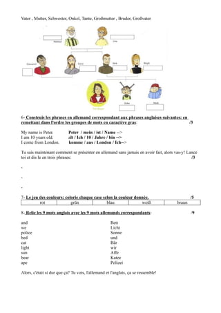 Le document propose divers exercices pour montrer les similitudes entre l'anglais et l'allemand. Les activités incluent la classification des jours de la semaine, l'association des saisons aux mois, et des exercices sur le vocabulaire de base. L'objectif est de rendre l'apprentissage de l'allemand accessible et interactif.