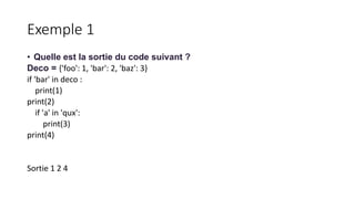 Le document traite de l'utilisation des conditions et des boucles en Python, illustrant des concepts avec des exemples de code. Il présente des structures conditionnelles comme 'if', 'elif', et 'else', ainsi que les boucles 'for' et 'while', en abordant des exercices pratiques. Des explications concernant la manipulation de dictionnaires et des types de collections en Python sont également fournies.