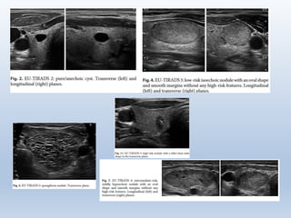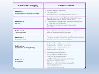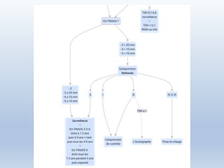Le document traite des nodules thyroïdiens, décrit leur épidémiologie, pathogénie et risques associés, en soulignant la prévalence accrue chez les femmes et les enfants. Les approches diagnostiques incluent l'évaluation clinique, biologique et échographique, et le traitement varie de la surveillance active à la chirurgie selon les caractéristiques des nodules. Le suivi après l'intervention et les spécificités liées à la grossesse ou à d'autres conditions médicales sont également abordés.
