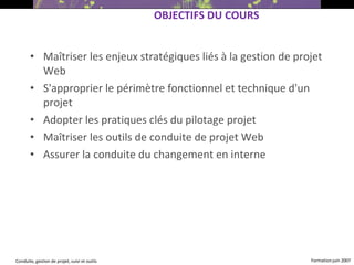 Le document traite des méthodologies et outils de gestion de projets web, se concentrant sur les enjeux stratégiques, le périmètre fonctionnel et technique, ainsi que la gestion des ressources humaines et des risques. Il aborde également les rôles et qualités du chef de projet, ainsi que les étapes clés du cycle de vie d'un projet, de la conception à la terminaison. Enfin, il souligne l'importance de la communication et de la collaboration entre les acteurs du projet pour garantir sa réussite.