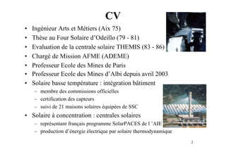 Le document présente les différentes technologies de production d'électricité à partir de l'énergie solaire, en se concentrant sur les procédés à concentration thermique. Il aborde également les enjeux énergétiques mondiaux et la nécessité d'une transition vers des énergies renouvelables face à l'épuisement des ressources fossiles. Enfin, il souligne que le solaire thermique concentré constitue une alternative crédible au charbon pour la production d'électricité centralisée.