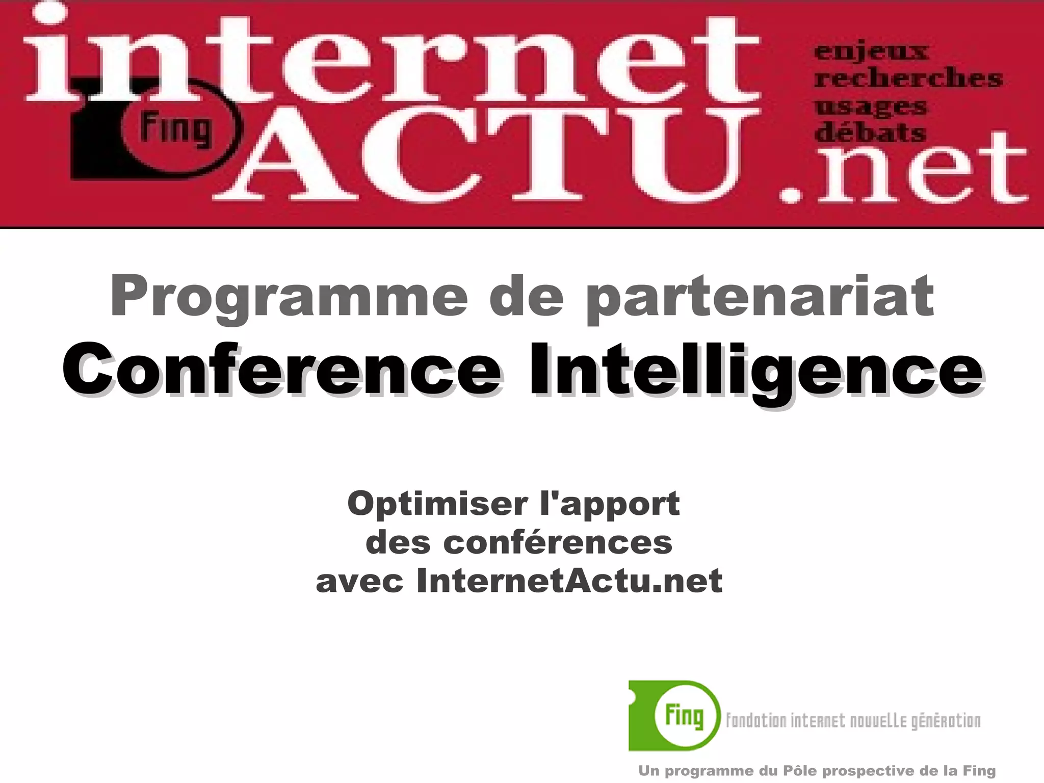 Le document présente un programme de partenariat pour optimiser la couverture des conférences sur les nouvelles technologies via internetactu.net, offrant des comptes-rendus complets et des analyses didactiques. Il décrit différents niveaux de partenariat (silver, gold, platine) avec des prestations variées, telles que des publications et des ateliers-débat, selon le budget et le lieu de la conférence. Les organisations peuvent devenir partenaires de la Fing pour maximiser leur participation et accéder à divers événements et ressources supplémentaires.