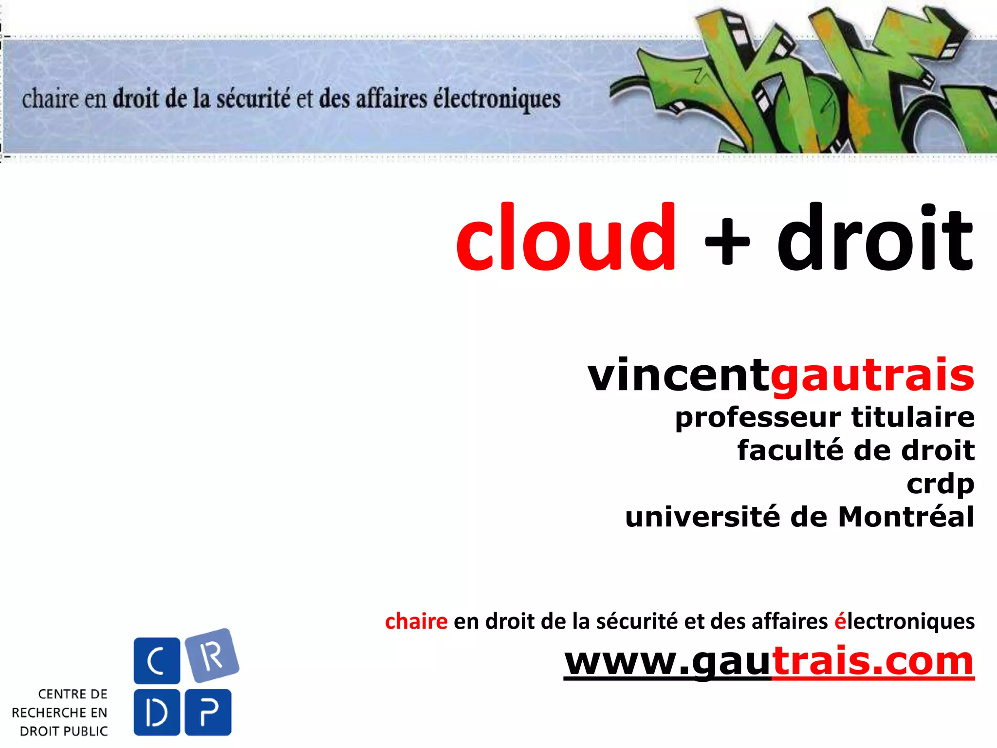 Le document aborde les implications juridiques du cloud computing, en examinant des perspectives politiques, constitutionnelles, de gestion documentaire et juridiques. Il souligne des préoccupations concernant la sécurité, la responsabilité des prestataires de services cloud et la gestion des données personnelles. En conclusion, il recommande de lire attentivement les contrats et de documenter les procédures de diligence pour naviguer dans le paysage juridique complexe du cloud.