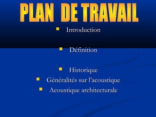 Le document traite du confort acoustique qui impacte la qualité de vie au quotidien et présente l'acoustique architecturale ainsi que des méthodes pour améliorer le confort sonore dans les bâtiments. Il explore l'historique de l'acoustique, les caractéristiques des sons et les types de bruits, tout en proposant des solutions techniques pour optimiser l'acoustique intérieure. En conclusion, il souligne l'importance d'une conception adéquate et de techniques d'insonorisation pour garantir un environnement sonore agréable.