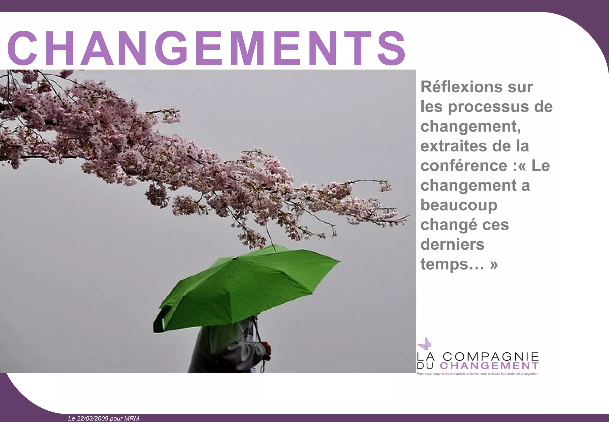 Ce document examine la nature omniprésente et complexe du changement au début du XXIe siècle, en explorant des thèmes tels que la mondialisation et les évolutions technologiques. Il soulève des questions sur la définition du changement et son rôle potentiel en tant que solution aux crises contemporaines. Les réflexions s'articulent autour de l'idée que le changement, bien qu'intangible et souvent source de désordre, est intrinsèque à la condition humaine et à l'évolution des sociétés.