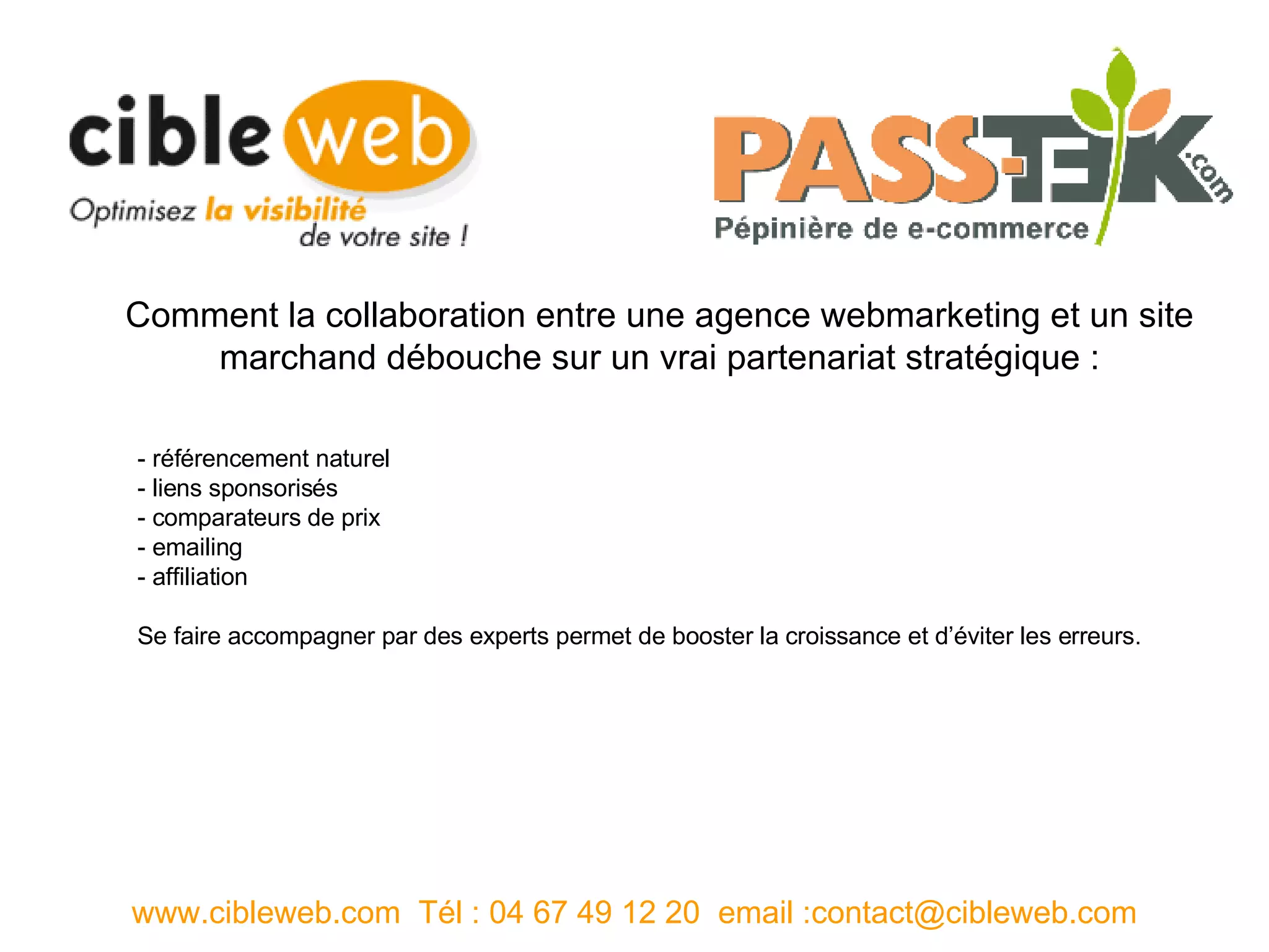 Le document présente l'agence Pass-Tek, spécialisée dans le e-commerce de proximité, qui accompagne les professionnels dans leurs ventes en ligne. Il détaille les services offerts, tels que le coaching e-achat et e-vente, ainsi que les résultats financiers impressionnants des entreprises partenaires. En outre, il souligne l'importance de diverses stratégies digitales telles que le référencement naturel et payant, les comparateurs de prix, et l'emailing pour optimiser la visibilité et la rentabilité des sites marchands.