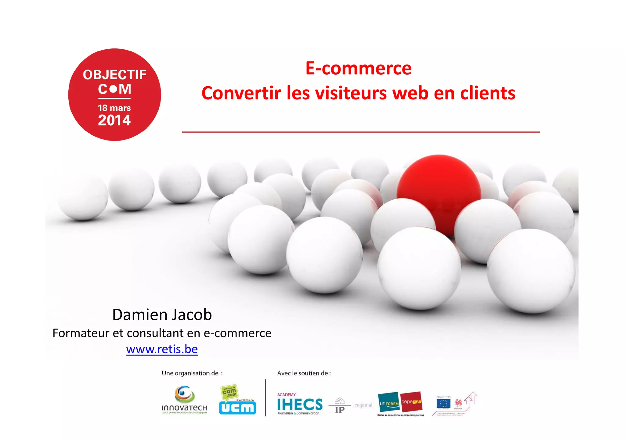 Le document présente les étapes clés pour convertir les visiteurs en clients dans l'e-commerce, en se concentrant sur l'attraction, la séduction, la conviction, le service et la fidélisation. Il fournit des conseils sur l'ergonomie, la navigation et l'e-marchandising pour améliorer l'expérience utilisateur, ainsi que des stratégies pour rassurer les clients face à leurs angoisses concernant la sécurité et la livraison. Enfin, il souligne l'importance d'offrir des informations claires et des modalités de service après-vente pour instaurer la confiance.
