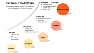 Le document présente une stratégie d'inbound marketing centrée sur l'individu, avec des objectifs d'amélioration de l'image de marque et d'accroissement de la visibilité en B2B. Il souligne l'importance du contenu de qualité, notamment à travers des blogs et des pages de destination, pour augmenter le taux de conversion et l'engagement des clients. Les résultats montrent une augmentation significative du trafic et des conversions grâce à ces initiatives.