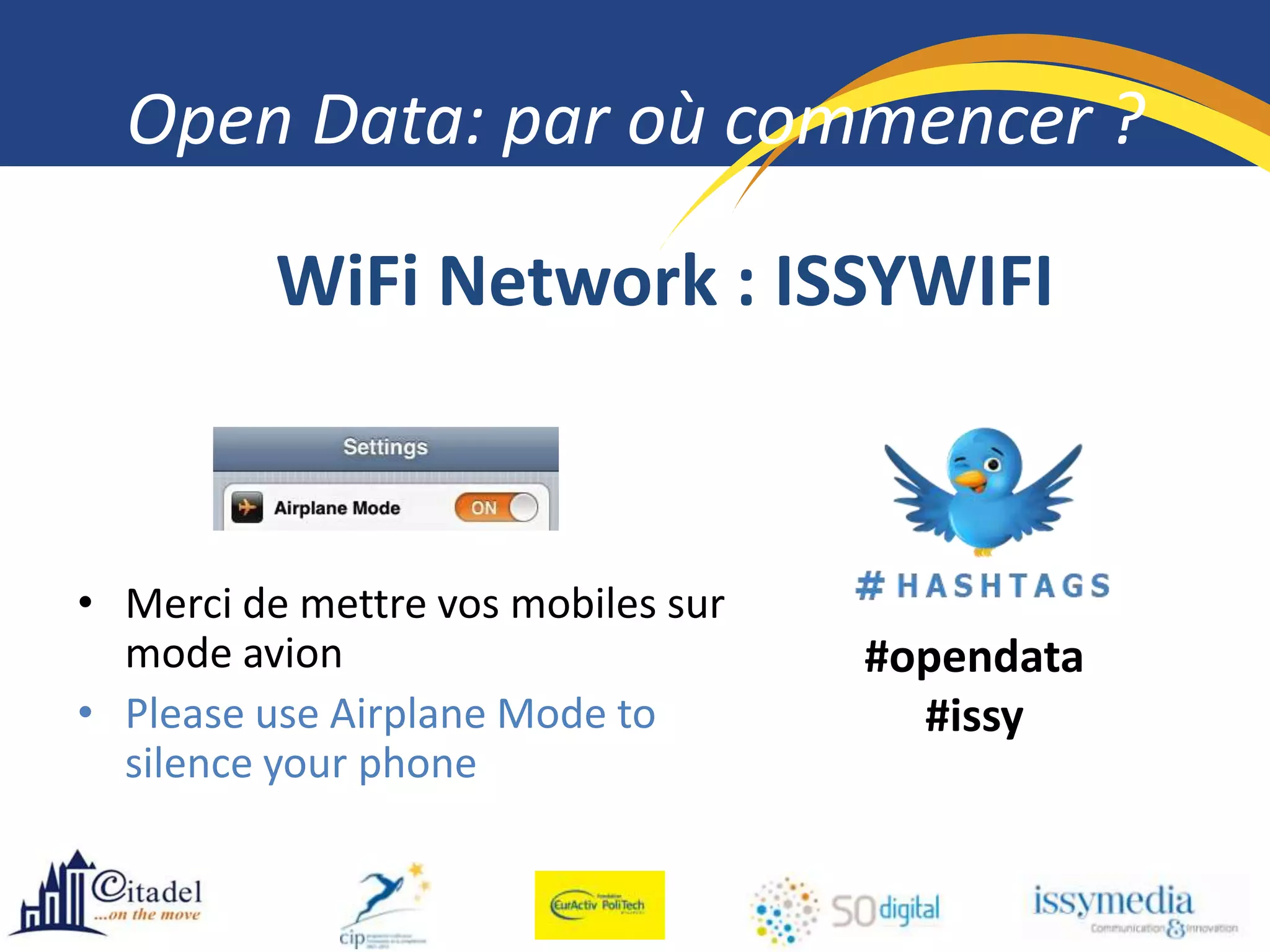 Le document présente une initiative de données ouvertes lancée par Eric Legale à Issy-les-Moulineaux, visant à développer des applications innovantes et à encourager la participation du public comme bêta-testeurs. Il indique également des étapes clés, notamment des phases spécifiques pour les développeurs et le grand public entre novembre 2012 et septembre 2014.