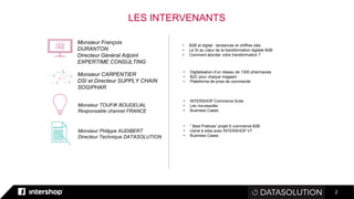 Le document présente une série de conférences sur la transformation digitale dans le commerce B2B, avec des experts discutant des tendances, des meilleures pratiques et des expériences concrètes, notamment pour un réseau de 1300 pharmacies. Il met l'accent sur l'importance de l'expérience client dans le contexte de la digitalisation, évoquant les défis et les succès liés à l'implémentation de solutions e-commerce. Enfin, il souligne le rôle central des systèmes d'information dans cette transformation et fournit des détails sur des projets spécifiques réalisés dans le secteur pharmaceutique.