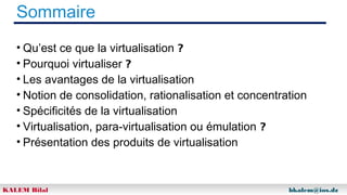Le document présente une introduction à la virtualisation, définissant la virtualisation comme la possibilité de faire fonctionner plusieurs systèmes d'exploitation sur un seul ordinateur. Il explique les avantages tels que la réduction des coûts, l'amélioration de la qualité de service et la simplification de l'administration, tout en abordant les notions de consolidation et d'indépendance matérielle des machines virtuelles. Enfin, il traite des différentes technologies de virtualisation, y compris la virtualisation complète, la para-virtualisation et l'émulation.