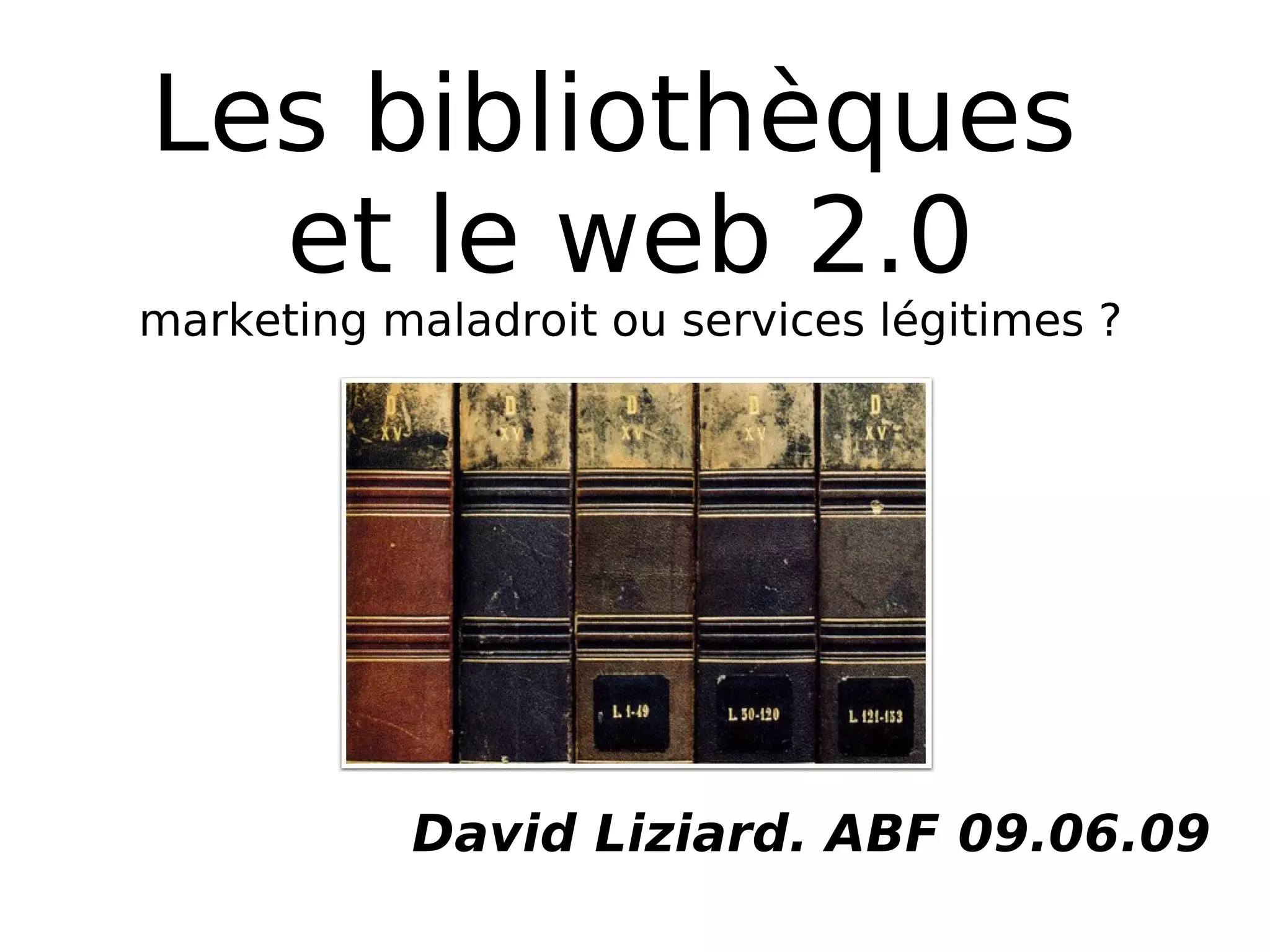 L'article de David Liziard aborde le rôle des bibliothèques dans le contexte du Web 2.0, en questionnant si les services offerts sont des tentatives maladroites de marketing ou des contributions légitimes. Il évoque divers outils et ressources, comme des blogs littéraires et des catalogues en ligne, tout en soulignant l'importance d'aider l'utilisateur à naviguer dans l'information. La conclusion insiste sur la nécessité d'orienter l'usager dans ses recherches.
