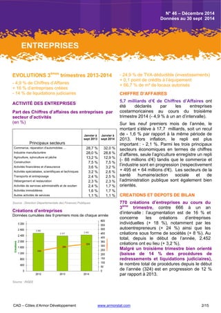 Le document présente une analyse économique des Côtes-d'Armor pour le troisième trimestre 2014, mettant en évidence une hausse des créations d'entreprises et une stabilisation de l'emploi, malgré une baisse des chiffres d'affaires et des investissements. Les exportations et la construction de logements restent préoccupantes, témoignant d'une situation économique difficile au niveau national. Enfin, le chômage continue d'augmenter, notamment chez les jeunes et les séniors, tandis que le recours à l'activité partielle et les licenciements économiques sont en hausse.