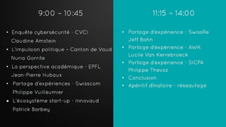 Le document met en évidence l'augmentation des cyberattaques, avec 37 % des entreprises touchées, tandis que 35 % se considèrent peu préoccupées par les cyber-risques. Il souligne l'importance d'une stratégie collaborative en cybersécurité et présente des initiatives comme le centre pour la confiance numérique à l'EPFL et le projet de protection des données pour la santé personnalisée. Les défis de sécurité, notamment dans le domaine de la santé, sont également abordés, avec des recommandations pour améliorer la gouvernance et la sensibilisation aux cybermenaces.