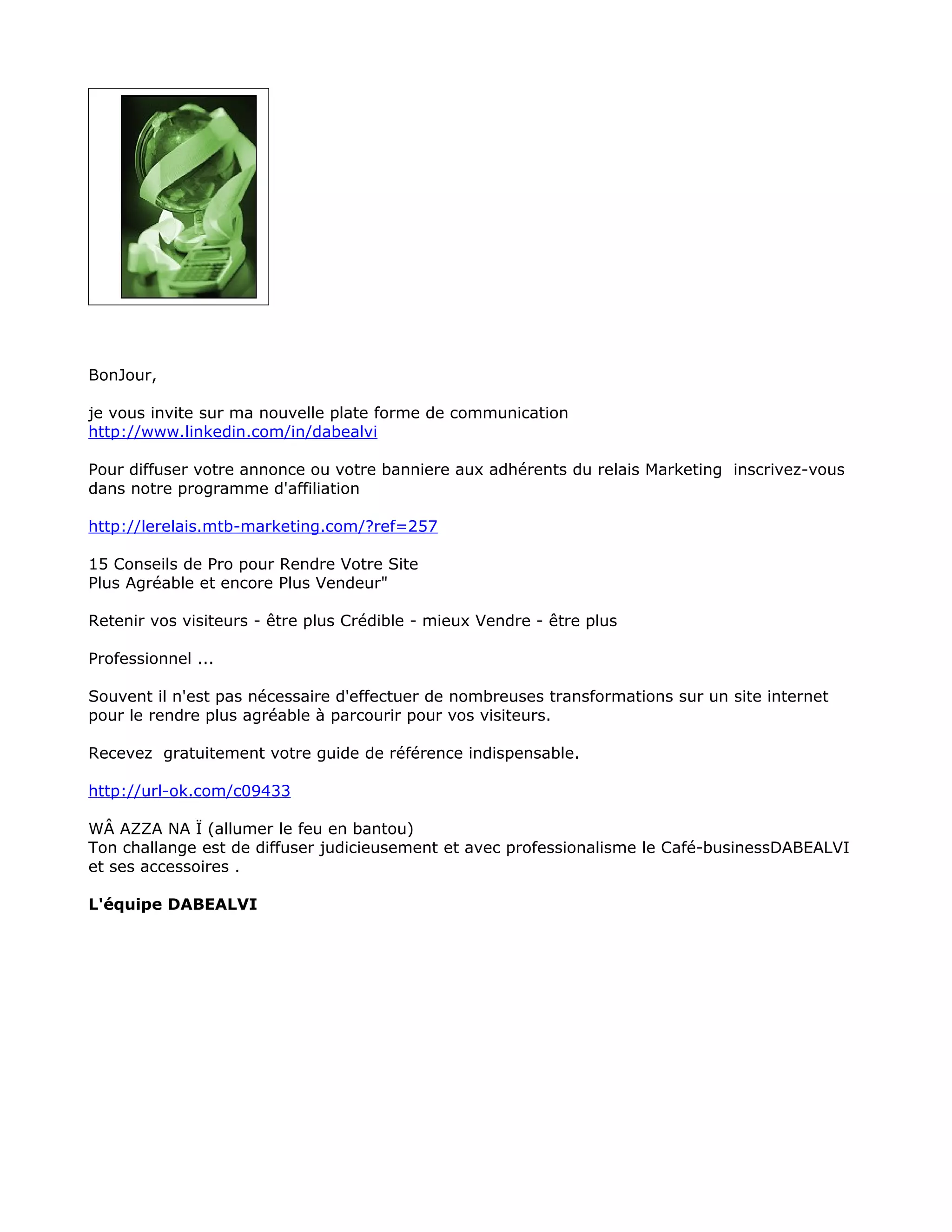 Le document présente une nouvelle plateforme de communication pour diffuser des annonces et offre un programme d'affiliation pour les adhérents au relais marketing. Il propose également 15 conseils pour améliorer l'attrait et l'efficacité des sites web. Enfin, il invite à recevoir un guide de référence gratuit et à diffuser le café-business dabealvi.