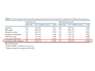 L'étude présente les conséquences des hémorragies lors des hépatectomies, mettant en évidence la médiane de perte sanguine et les scores de morbidité. Les résultats montrent que les pertes sanguines peropératoires affectent significativement les suites opératoires et que les transfusions ont des implications oncologiques. Les facteurs de risque identifiés incluent le BMI, les gestes associés, l'ischémie du foie restant et la perte sanguine, chacun ayant des implications sur la morbidité sévère.