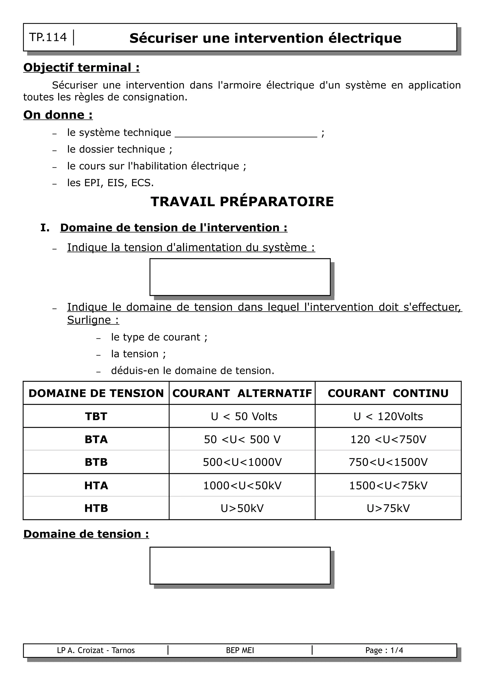 Le document décrit les étapes et procédures nécessaires pour sécuriser une intervention dans une armoire électrique, en respectant les règles de consignation et en identifiant le domaine de tension du système. Il inclut des éléments sur l'habilitation électrique requise, le matériel de protection nécessaire, ainsi que les précautions à prendre lors de l'utilisation d'un vérificateur d'absence de tension. Des exercices pratiques sont également prévus pour appliquer ces procédures en présence d'un professeur.