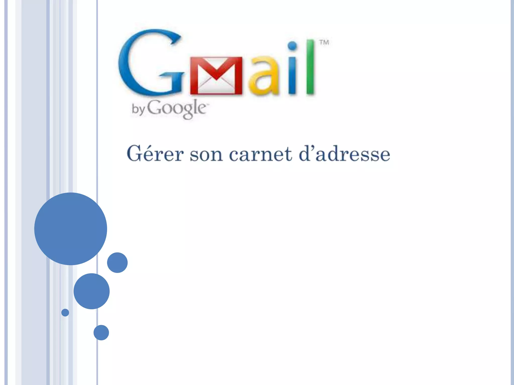 Le document fournit des instructions sur la gestion d'un carnet d'adresses dans Gmail, incluant l'affichage, l'ajout, la modification, et l'import/export des contacts. Il propose également des conseils pour configurer la boîte de réception et des informations de contact pour des questions ou améliorations. Les fonctionnalités de synchronisation des contacts sont également abordées.