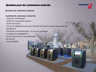 Le document décrit un système de conteneurs enterrés offrant des solutions esthétiques, hygiéniques et respectueuses de l'environnement pour la gestion des déchets. Il comprend des bornes d'introduction, des conteneurs en plastique ou métal, et des structures modulaires adaptées aux dénivelés. Les systèmes garantissent sécurité, efficacité de collecte, et minimisent l'encombrement sur la voie publique.