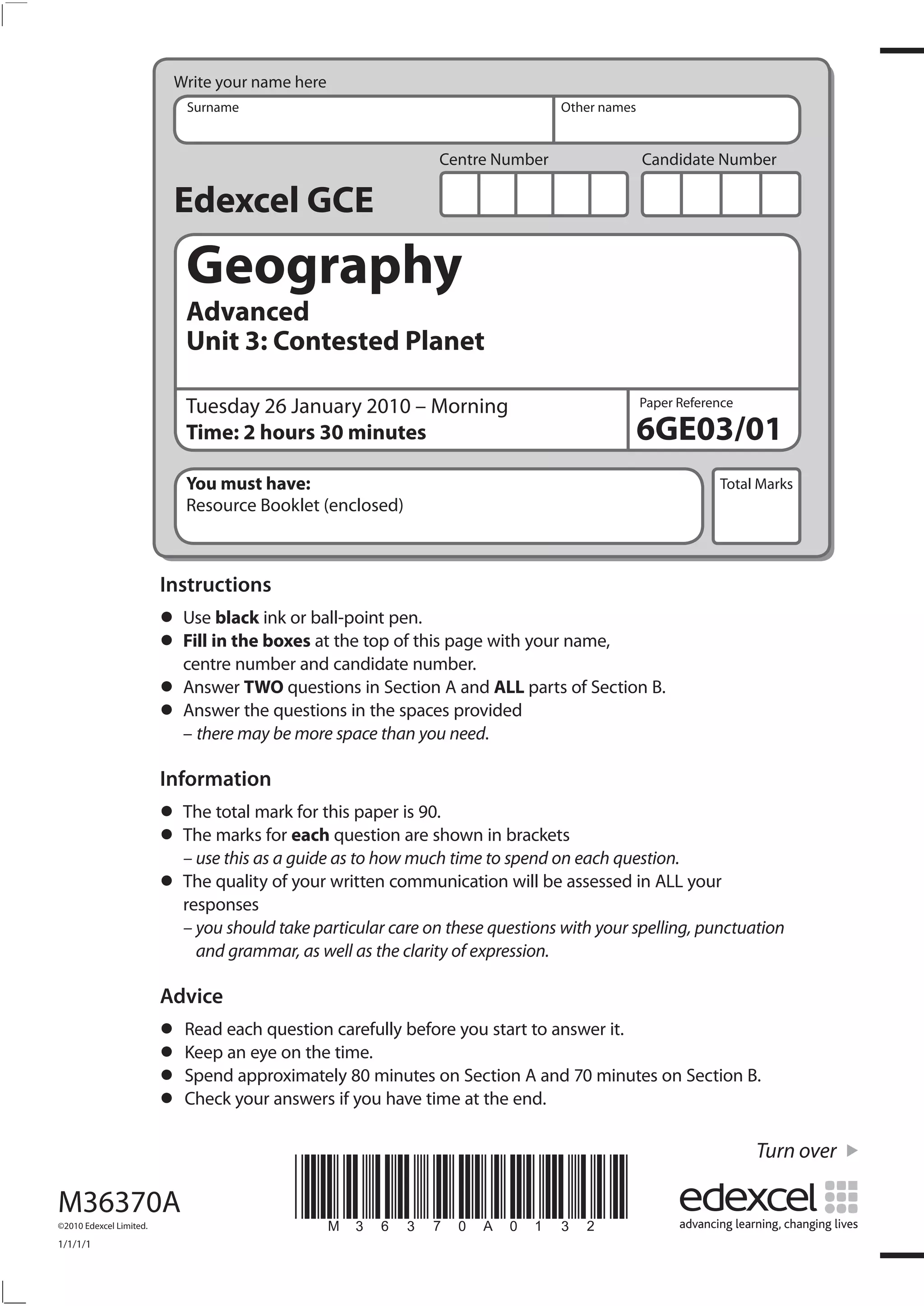 Le document présente les instructions pour un examen de géographie GCE avancé, comprenant deux sections avec un total de 90 points. Les candidats doivent répondre à deux questions de la section A et toutes les questions de la section B, en utilisant des exemples et en restant attentifs à la qualité de leur communication écrite. Les questions couvrent des sujets tels que la sécurité énergétique, les conflits liés à l'eau, la biodiversité, l'écart de développement et les technologies agricoles.