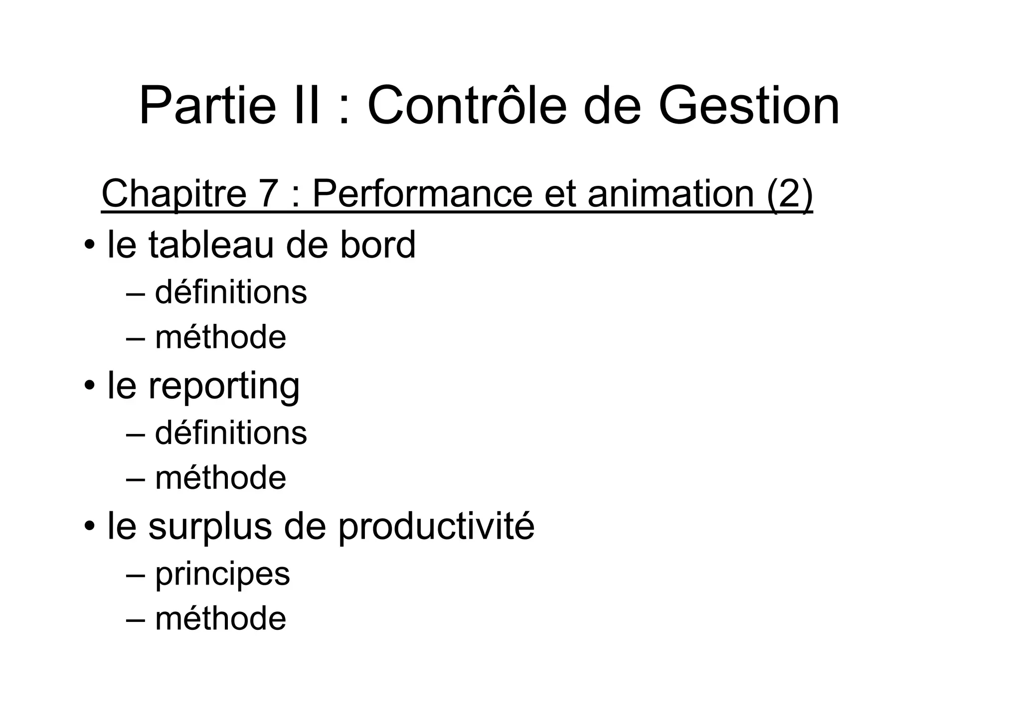 Le document traite des outils de contrôle de gestion, en particulier le tableau de bord et le reporting, qui sont essentiels pour mesurer la performance et guider les décisions des responsables. Il définit les caractéristiques et méthodes d'élaboration des tableaux de bord, ainsi que l'importance du surplus de productivité comme indicateur de performance. Enfin, il présente un cas pratique d'élaboration d'un tableau de bord pour améliorer le service après-vente d'une entreprise d'importation de composants informatiques.