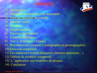 Le document présente une formation sur les contrôles non destructifs (CND) dirigée par Philippe Poinboeuf, couvrant des méthodes variées telles que l'examen visuel, le ressuage, la magnétoscopie, et les essais hydrauliques, parmi d'autres. Chaque méthode est accompagnée de ses principes, processus, et conditions d'application, mettant l'accent sur l'importance de la qualité et de la sécurité dans les contrôles des produits. La synthèse comprend également les qualifications nécessaires des opérateurs et les spécifications techniques requises pour réaliser ces contrôles efficacement.