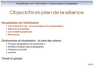 Le document présente une analyse des controverses scientifiques et techniques, en mettant l'accent sur la cartographie de ces controverses à travers des visualisations d'information. Il souligne l'importance de représenter les positions des acteurs et les enjeux liés pour permettre une compréhension claire des relations complexes au sein de ces controverses. Enfin, divers outils et méthodes de visualisation sont évoqués pour faciliter cette analyse et communication des données.