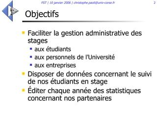 Le document présente une application web destinée à faciliter la gestion administrative des stages pour les étudiants, le personnel universitaire et les entreprises. Il décrit les étapes nécessaires pour remplir les conventions de stage, les types de conventions disponibles et les outils d'assistance dans le processus. L'application permet également de modifier ou de demander des avenants en cas de changements liés au stage.