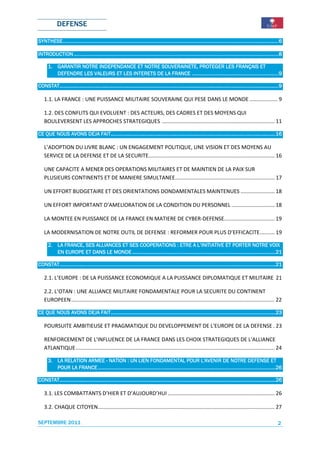 Le document traite de l'importance de la défense nationale française et des impératifs qu'elle représente pour la souveraineté et l'intérêt des citoyens. Il souligne la nécessité de maintenir une force militaire efficace et le soutien budgétaire nécessaire, tout en établissant des coopérations stratégiques en Europe et ailleurs. Les enjeux de défense sont présentés comme essentiels pour la sécurité, l'économie et le rayonnement de la France sur la scène internationale.