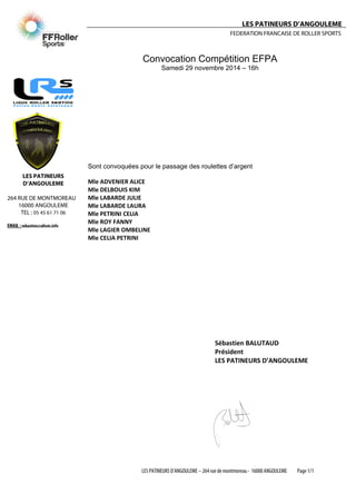 Les Patineurs d'Angoulême organisent une compétition de passage des roulettes d'argent le samedi 29 novembre 2014 à 16h. Les patineurs concernés sont listés dans le document, et la convocation est signée par Sébastien Balutaud, président de l'association. Pour plus d'informations, les coordonnées de l'association sont fournies.