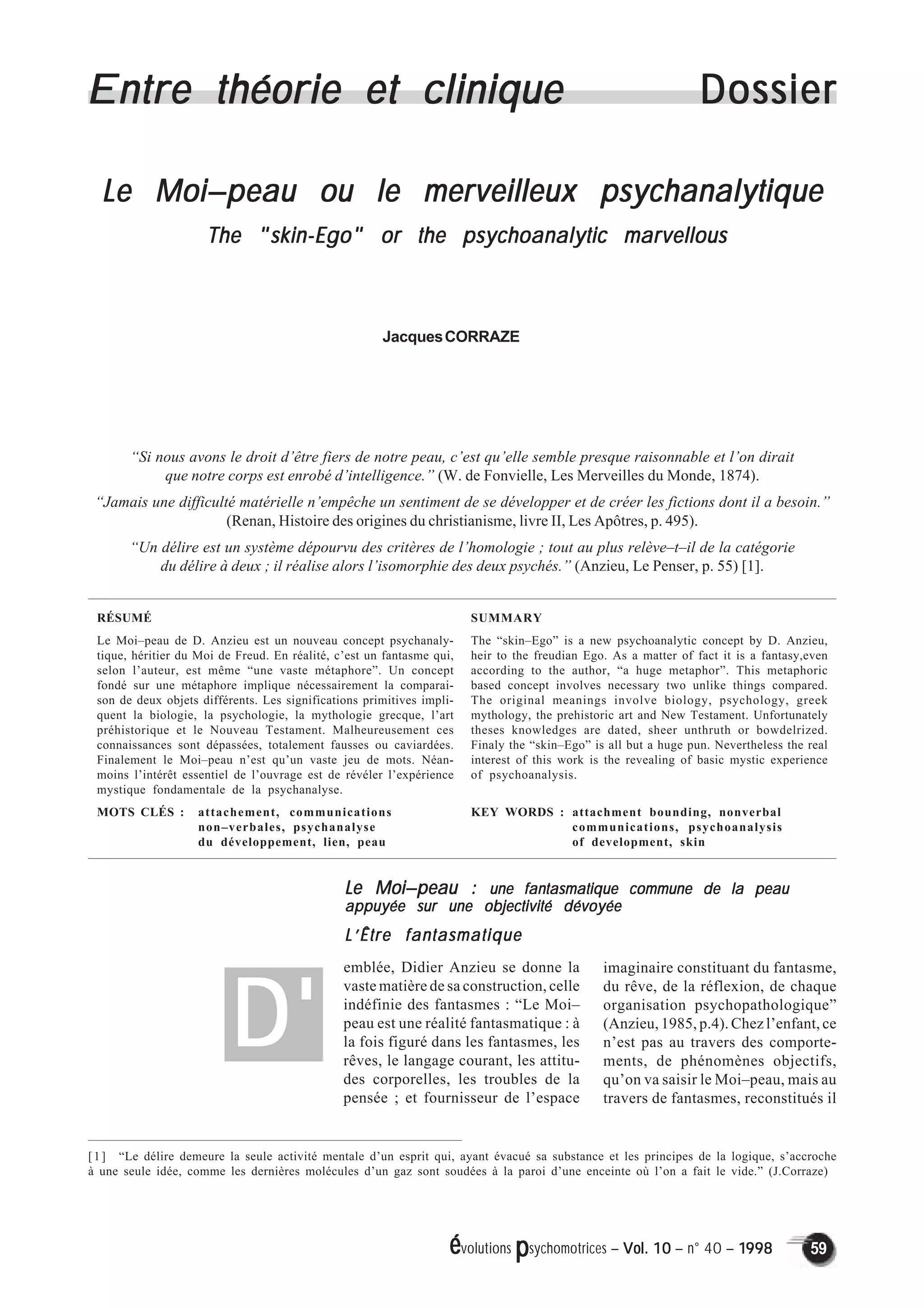 Le concept de 'moi-peau' de D. Anzieu est décrit comme une métaphore élaborée qui relie la psychanalyse à divers domaines tels que la biologie et la mythologie. Bien que le texte souligne l'importance des fantasmes dans la compréhension du 'moi-peau', il critique ce concept comme étant basé sur des métaphores trompeuses et des interprétations mal fondées. En somme, l'ouvrage explore des notions complexes de l'esprit humain tout en mettant en évidence les limites et ambiguïtés de l'approche métaphorique en psychanalyse.