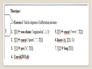 Le document présente des exercices de programmation, notamment sur la manipulation de tableaux et la résolution d'équations du premier degré. Il aborde également la saisie de données utilisateur pour calculer le poids idéal et l'indice de masse corporelle (IMC). Des erreurs de code et leurs solutions sont incluses, ainsi que des explications détaillées sur chaque exercice proposé.