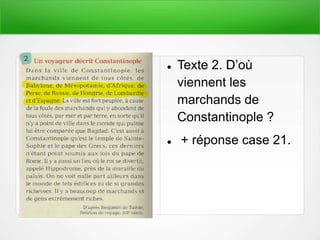 Le document traite des marchands de Constantinople, des influences architecturales romaines dans la ville, et du rôle de l'empereur byzantin Justinien qui a établi un code de lois important. Il évoque également la conquête d'anciens territoires, le rôle de Charlemagne, et les relations entre chrétiens et juifs dans les territoires musulmans. Enfin, il mentionne la fondation de Bagdad et ses particularités.