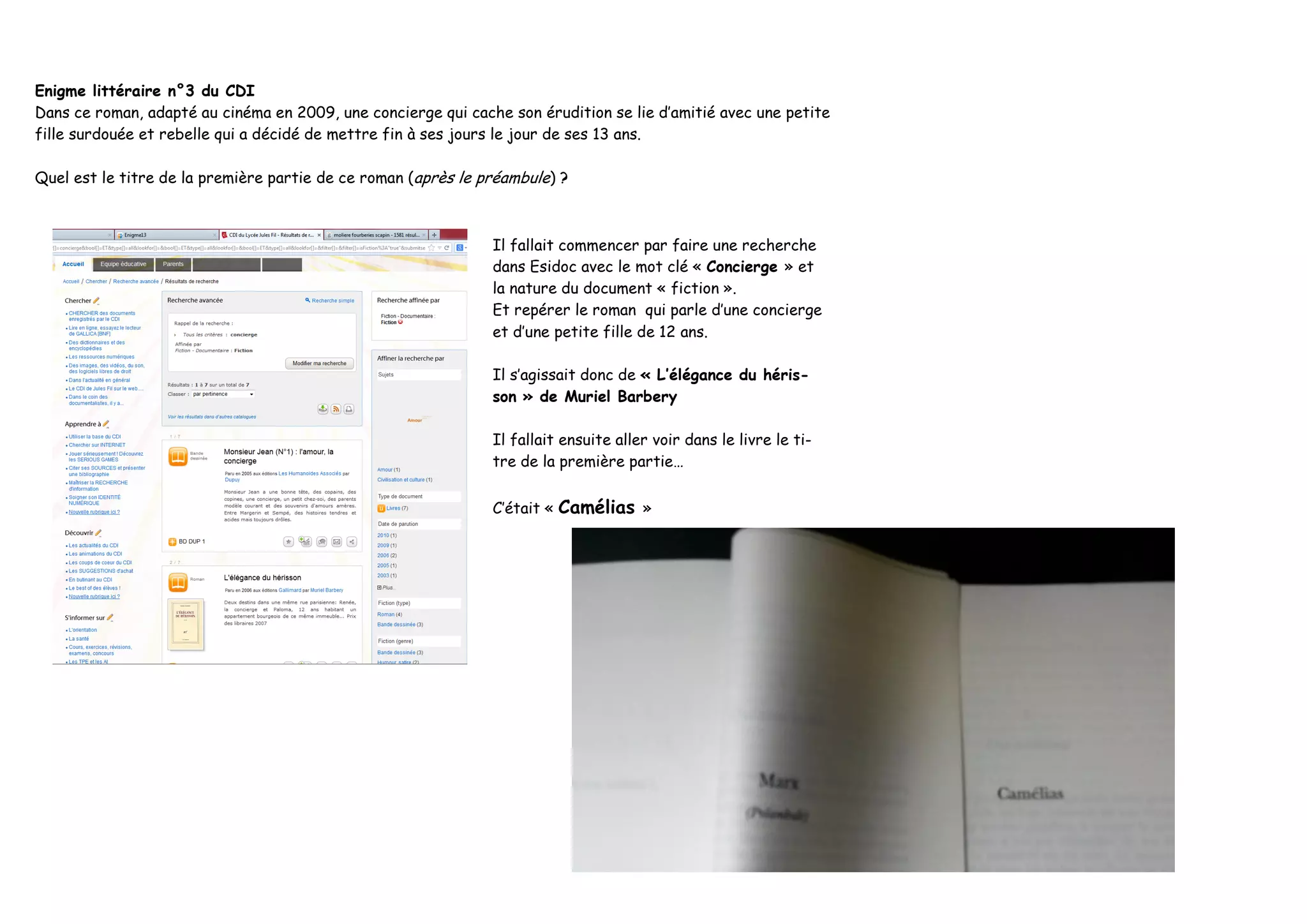 Le document présente une énigme littéraire sur un roman adapté au cinéma en 2009, centré sur une relation entre une concierge érudite et une jeune fille surdouée. Pour résoudre l'énigme, il faut identifier le roman qui est 'L'élégance du hérisson' de Muriel Barbery. La première partie du livre est intitulée 'Camélias'.