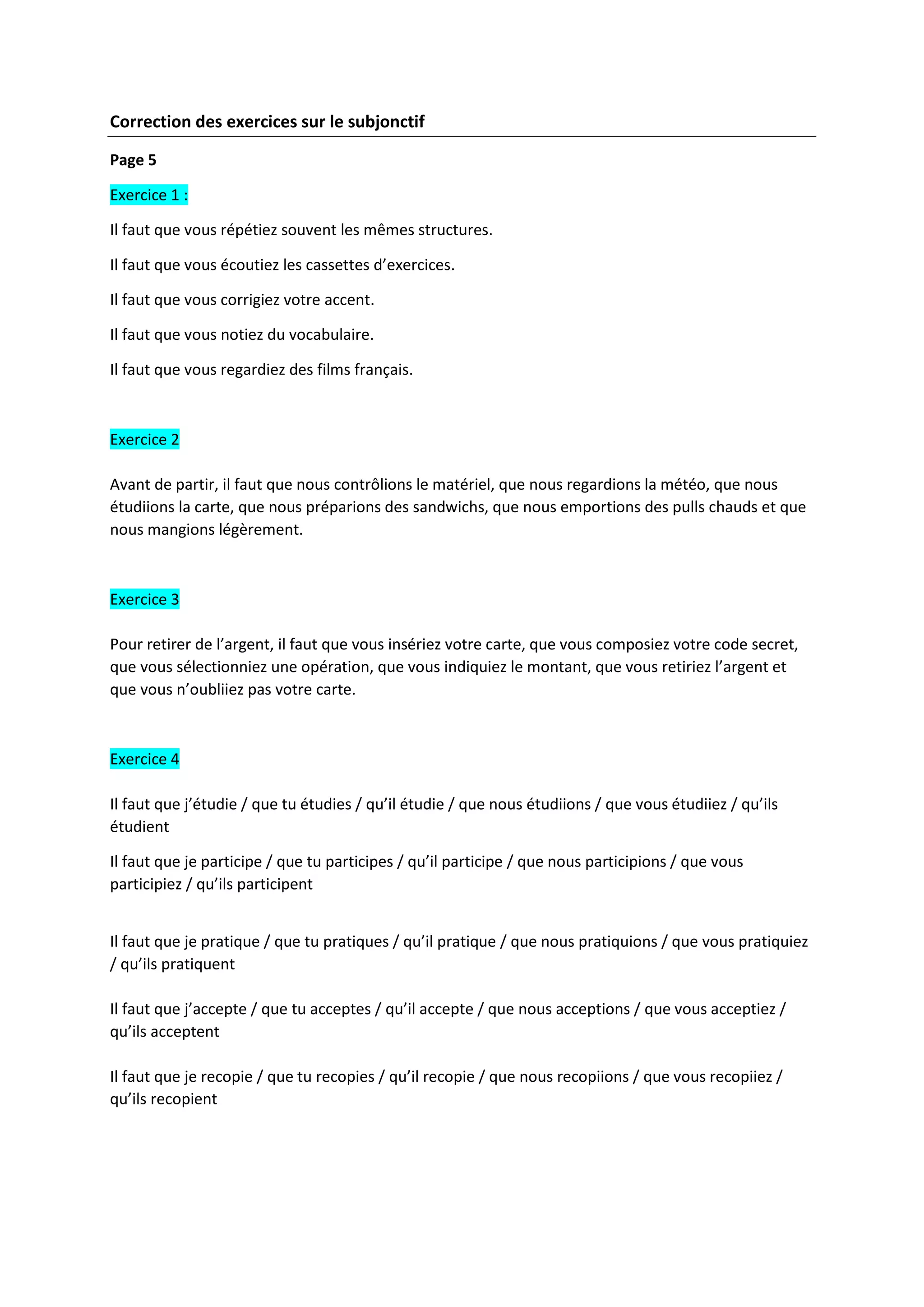 Le document présente des exercices pratiques sur l'utilisation du subjonctif en français, en décrivant des situations variées comme la préparation d'un voyage, le retrait d'argent et des opinions sur des sujets sociaux. Il inclut des phrases à compléter et des réflexions sur des problèmes contemporains. L'objectif est d'aider les apprenants à maîtriser les structures du subjonctif à travers des exemples concrets et des exercices interactifs.