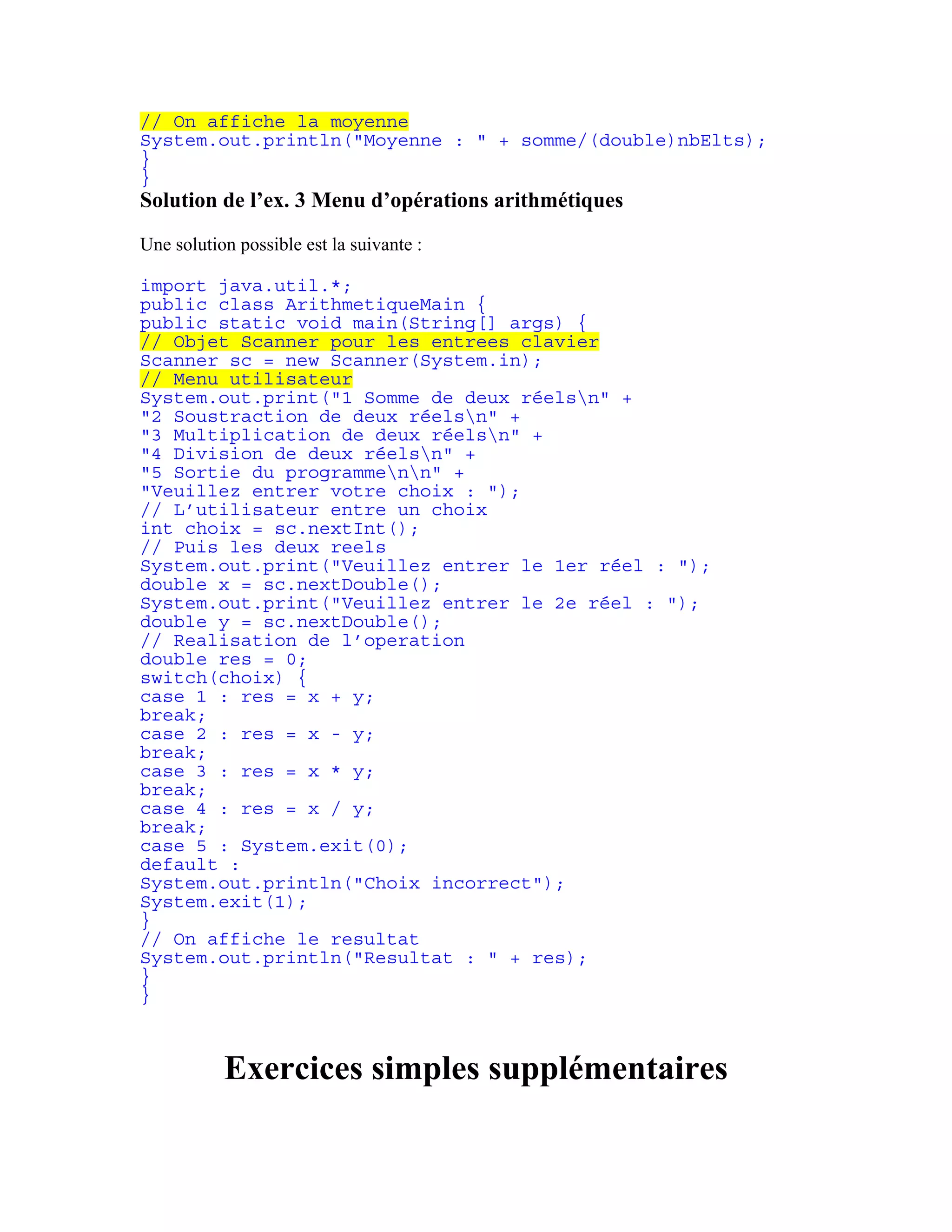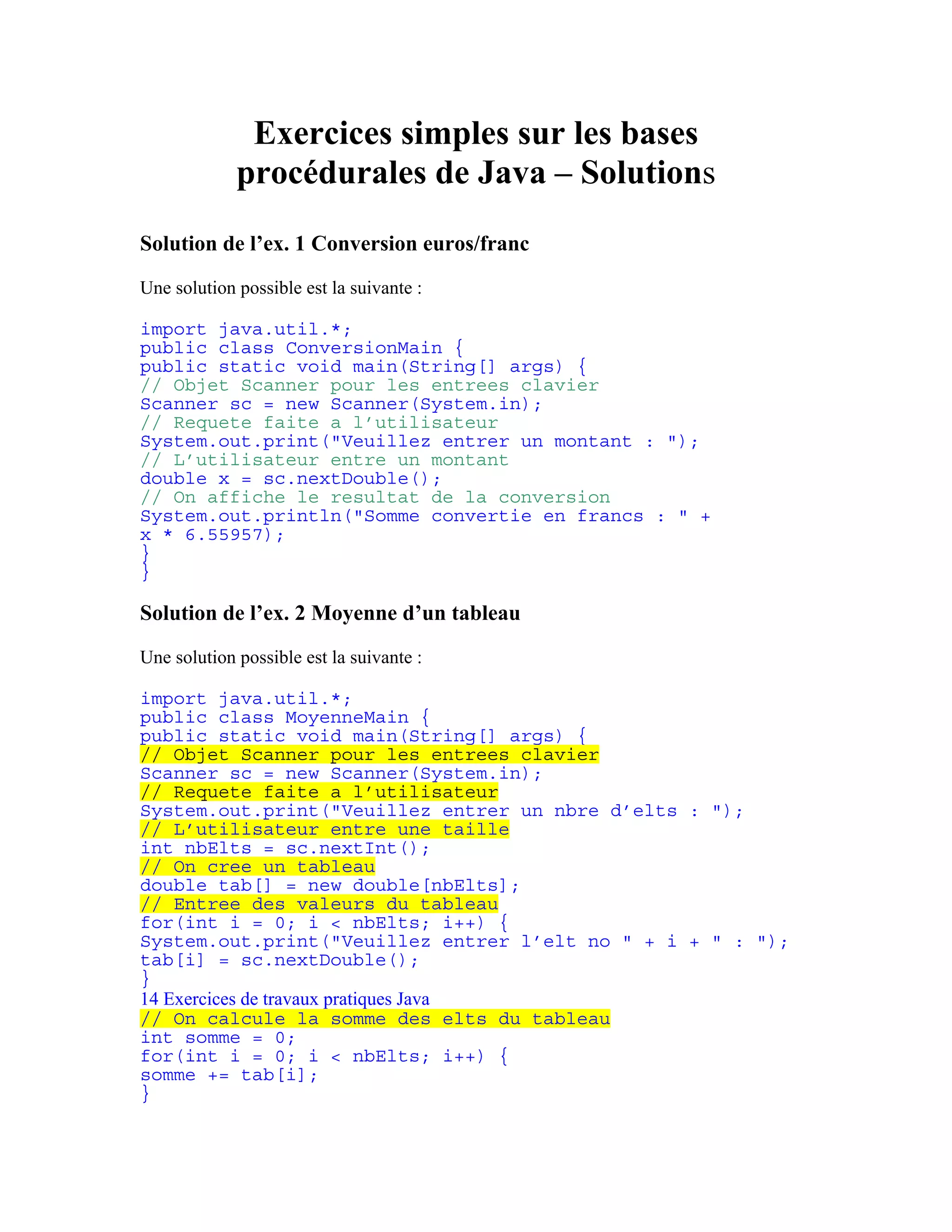 Le document présente des exercices de programmation Java, incluant des solutions pour des conversions monétaires, le calcul de moyennes, et des opérations arithmétiques. Il détaille également des exercices supplémentaires comme la décomposition en base dix et le tri de tableaux. De plus, il aborde des concepts avancés comme l'évaluation polynomiale et les tours de Hanoï.