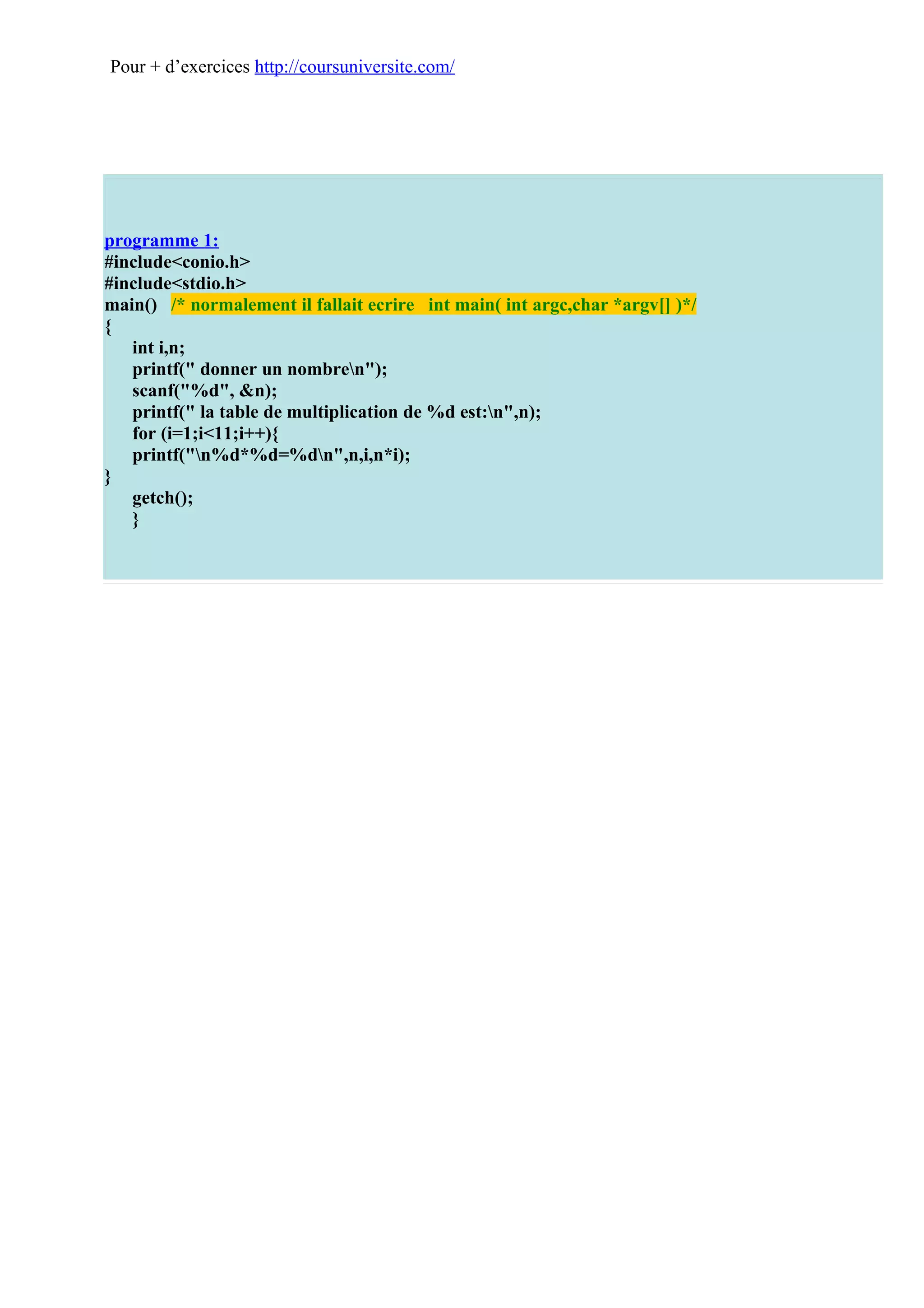 Le document présente plusieurs programmes en C qui illustrent des concepts clés tels que les tables de multiplication, la détermination du PGCD, la manipulation de matrices, et les calculs de puissances. Chaque programme est accompagné d'explications sur son fonctionnement et des exemples d'entrées et sorties. Les exercices sont accessibles via un lien, incitant à approfondir la pratique de la programmation en C.