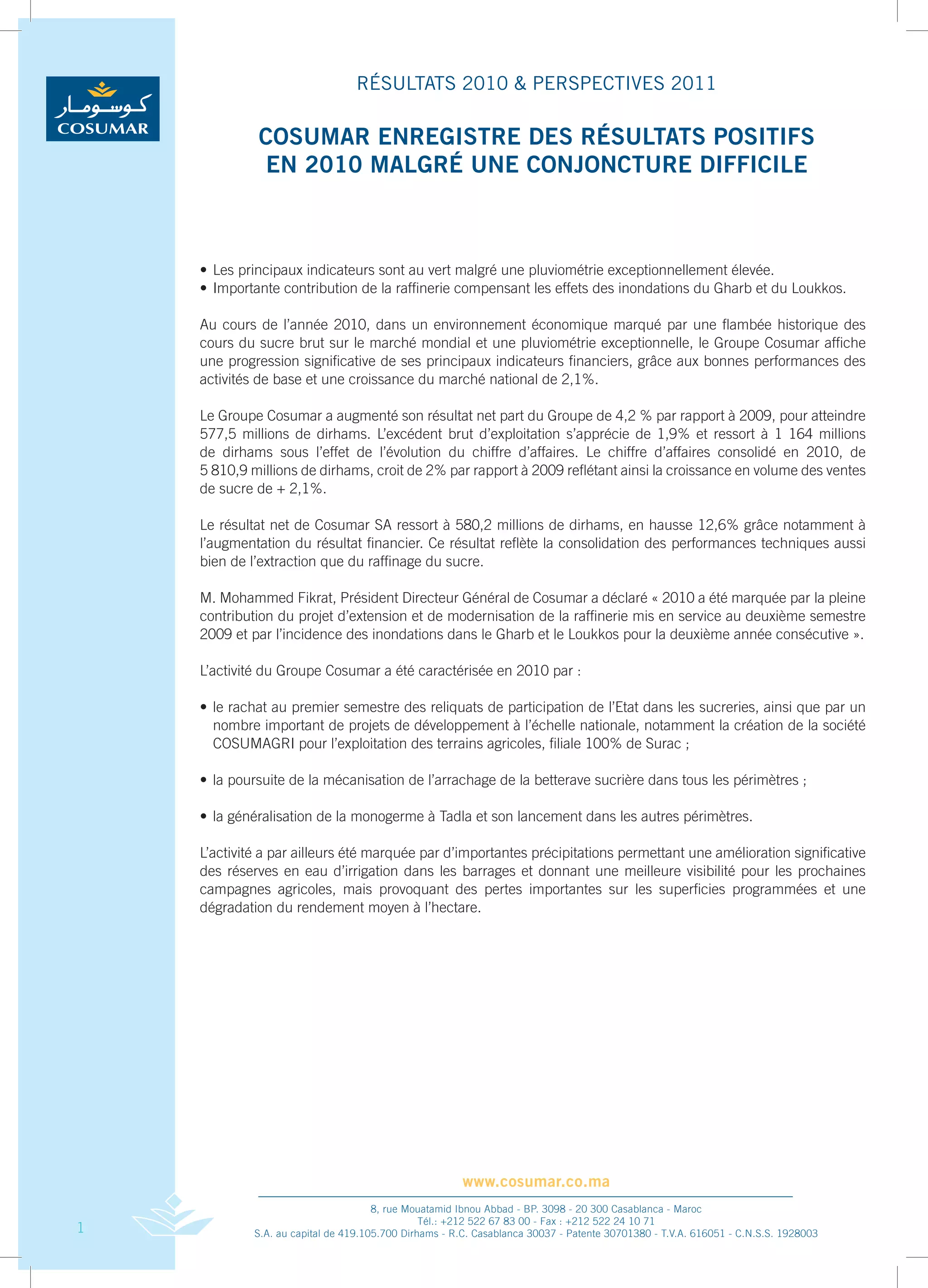 En 2010, Cosumar a affiché des résultats financiers positifs avec un résultat net en hausse de 4,2 % à 577,5 millions de dirhams, malgré des inondations impactant les récoltes. La compagnie a profité de bonnes performances en raffinage et d'une croissance du marché national de 2,1 %. Pour 2011, le groupe prévoit des investissements pour étendre sa capacité de traitement, tout en restant attentif à l'augmentation des coûts du sucre sur le marché mondial.
