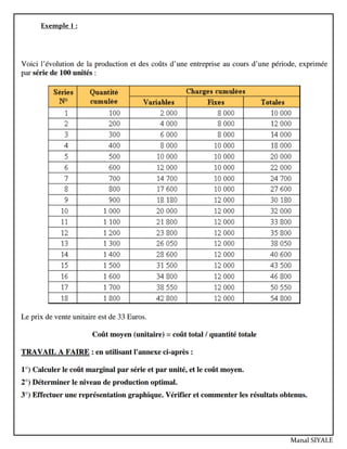 Le document traite du coût marginal, défini comme la variation du coût total liée à une augmentation ou diminution de la production. Il aborde des exemples d'application du coût marginal dans des entreprises et les méthodes d'analyse associées pour maximiser le profit, y compris l'optimum technique et économique. Des calculs illustrent comment les décisions de production peuvent être guidées par l'analyse des coûts et des bénéfices marginaux.