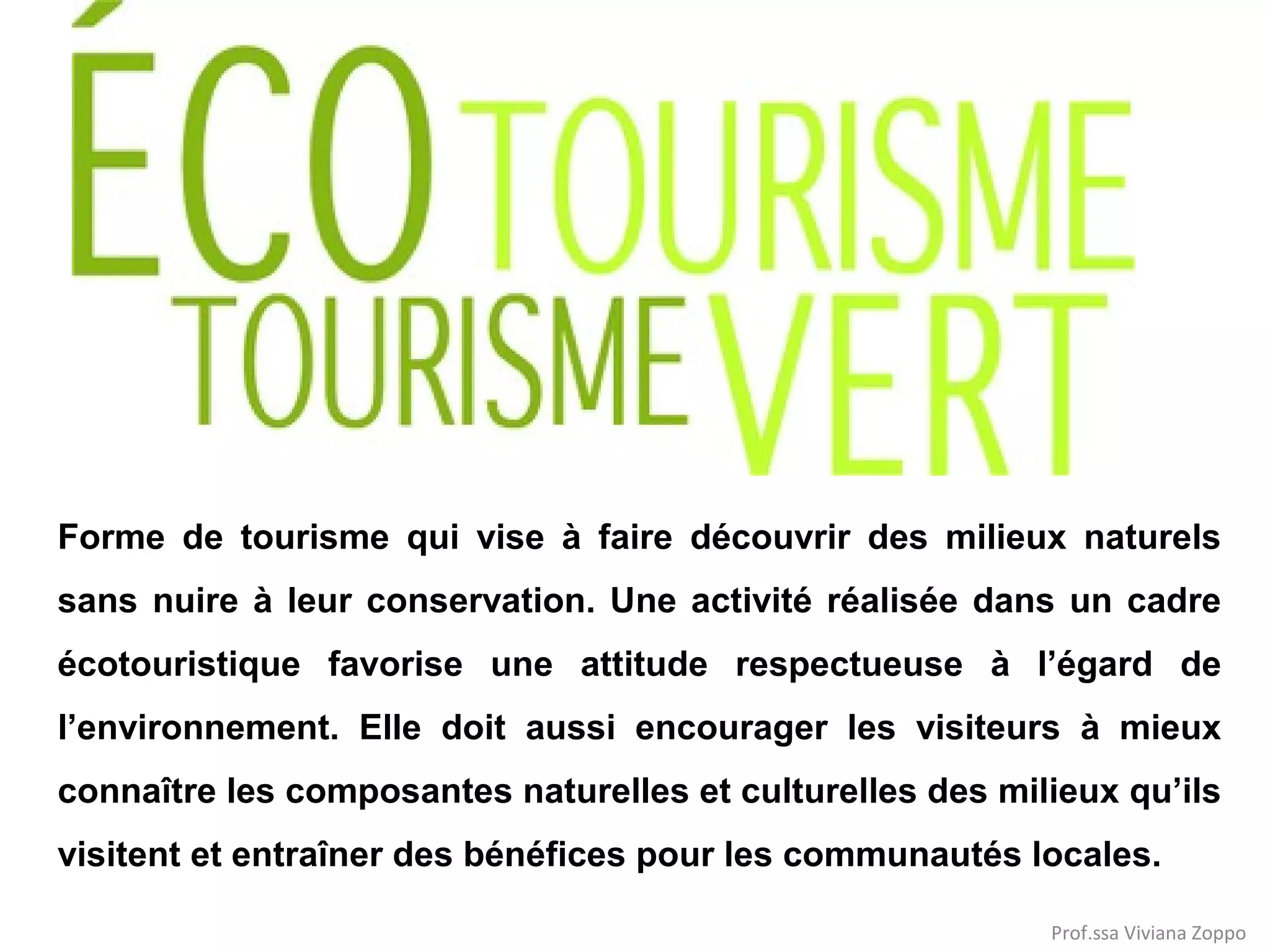 L'écotourisme est une forme de tourisme qui permet de découvrir des milieux naturels tout en préservant leur conservation et en apportant des bénéfices aux communautés locales. L'éco-label européen, créé en 1992, certifie les produits et services respectueux de l'environnement et encourage un développement durable. Ce texte souligne l'importance d'un voyage responsable en présentant les principes de l'écotourisme, ainsi que les conditions à respecter pour garantir un impact environnemental minimal.