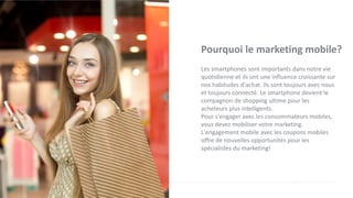 Le document présente les avantages du marketing mobile, en mettant l'accent sur l'utilisation de coupons mobiles gérés par la plateforme stpi.ca. Cette solution permet aux spécialistes du marketing d'engager les consommateurs par le biais de smartphones, en facilitant la création, la distribution et la validation de coupons tout en collectant des données clients précieuses. Les coupons mobiles offrent une grande commodité pour les consommateurs et des opportunités de revenus accrues pour les entreprises.