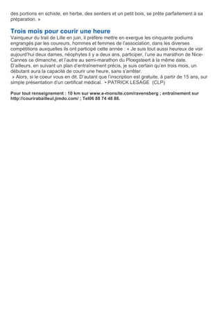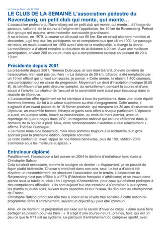 L'association pédestre du Ravensberg, fondée en 1979, a vu sa course évoluer pour devenir les 10 km du Ravensberg, attirant 1 400 participants cette année grâce à une organisation conviviale. Dirigée par Thérèse Dubruque, l'association se concentre sur la structuration des entraînements, avec des séances pour tous les niveaux et une recherche active de sponsors. Des podiums ont été remportés par les coureurs, renforçant la réputation du club dans le domaine des compétitions officielles.
