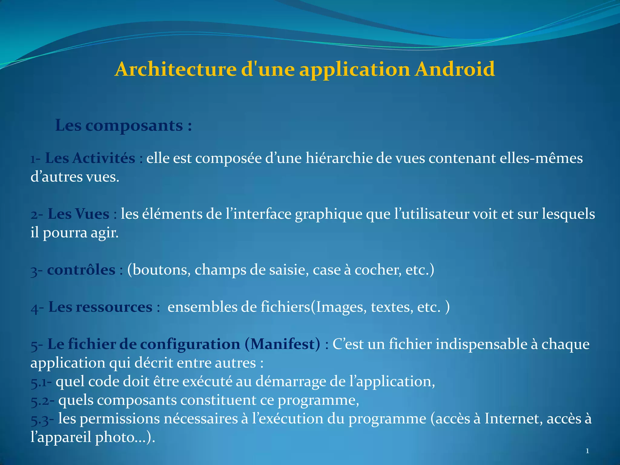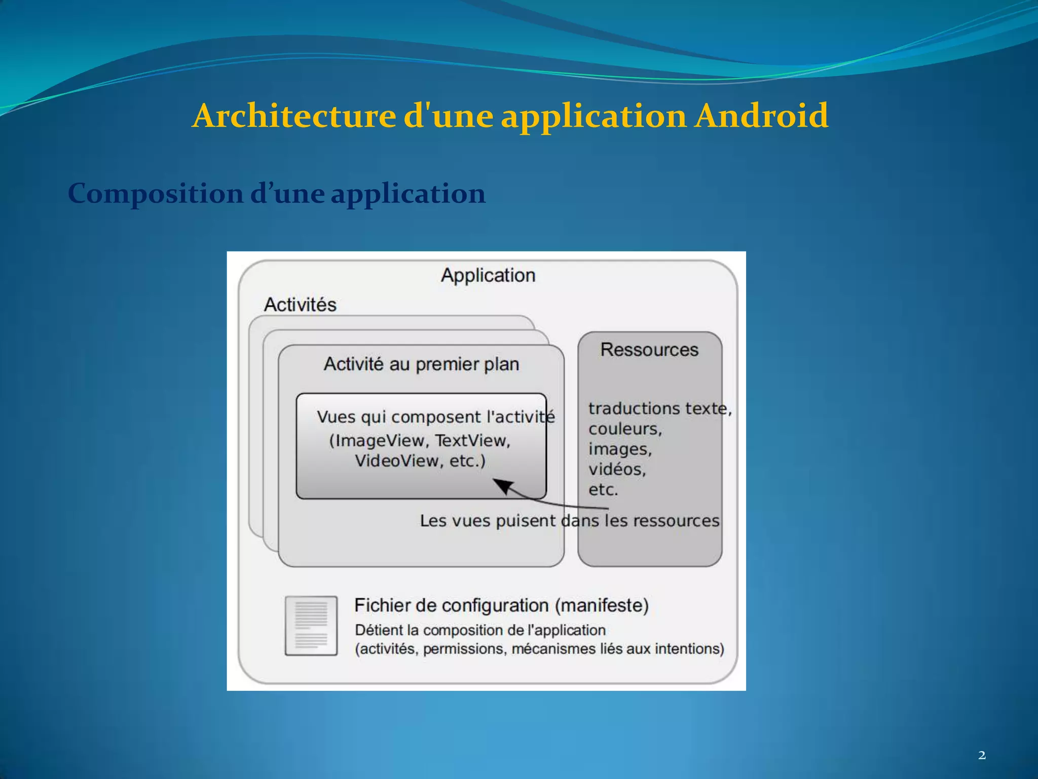 Ce document décrit l'architecture d'une application Android, en abordant ses composants principaux tels que les activités, les vues, et les services, ainsi que leur interaction à travers des intents et des notifications. Il souligne également l'importance du fichier de configuration (AndroidManifest.xml) qui déclare les permissions nécessaires et les composants de l'application, notamment les fournisseurs de contenu et les récepteurs d'intents. Enfin, il évoque la création d'interfaces utilisateur et la gestion des ressources au sein d'une application.