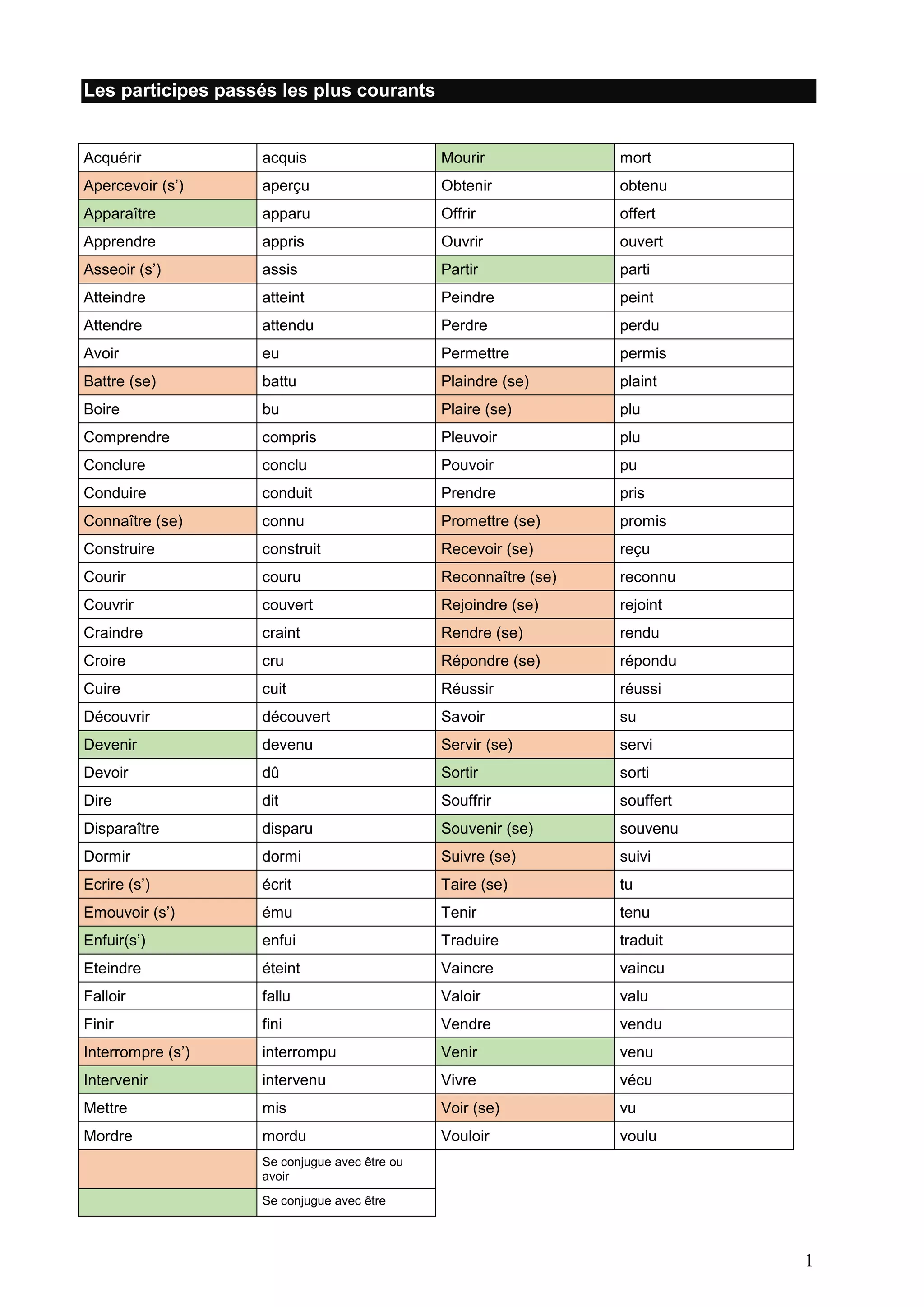 Le document présente une liste des participes passés les plus courants en français, accompagnés d'exemples d'utilisation. Il aborde également les règles de conjugaison des verbes au passé composé, en soulignant l'usage des auxiliaires 'être' et 'avoir'. Enfin, il propose des exercices pour pratiquer l'identification et l'accord des participes passés.