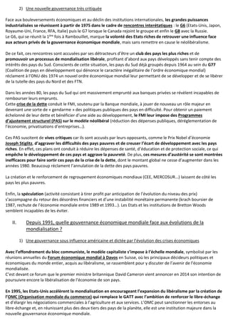 La gouvernance économique mondiale a évolué depuis 1975 face à des défis tels que la crise économique et la montée de la mondialisation, mettant en lumière une hiérarchie où les pays riches dominent. Malgré l'émergence de nouveaux acteurs comme le G20 et les pays du BRICS, les critiques persistent quant aux inégalités que le néolibéralisme exacerbe. Il existe un appel croissant pour une gouvernance économique plus équitable et démocratique, bien que des obstacles demeurent pour parvenir à un système réellement inclusif.
