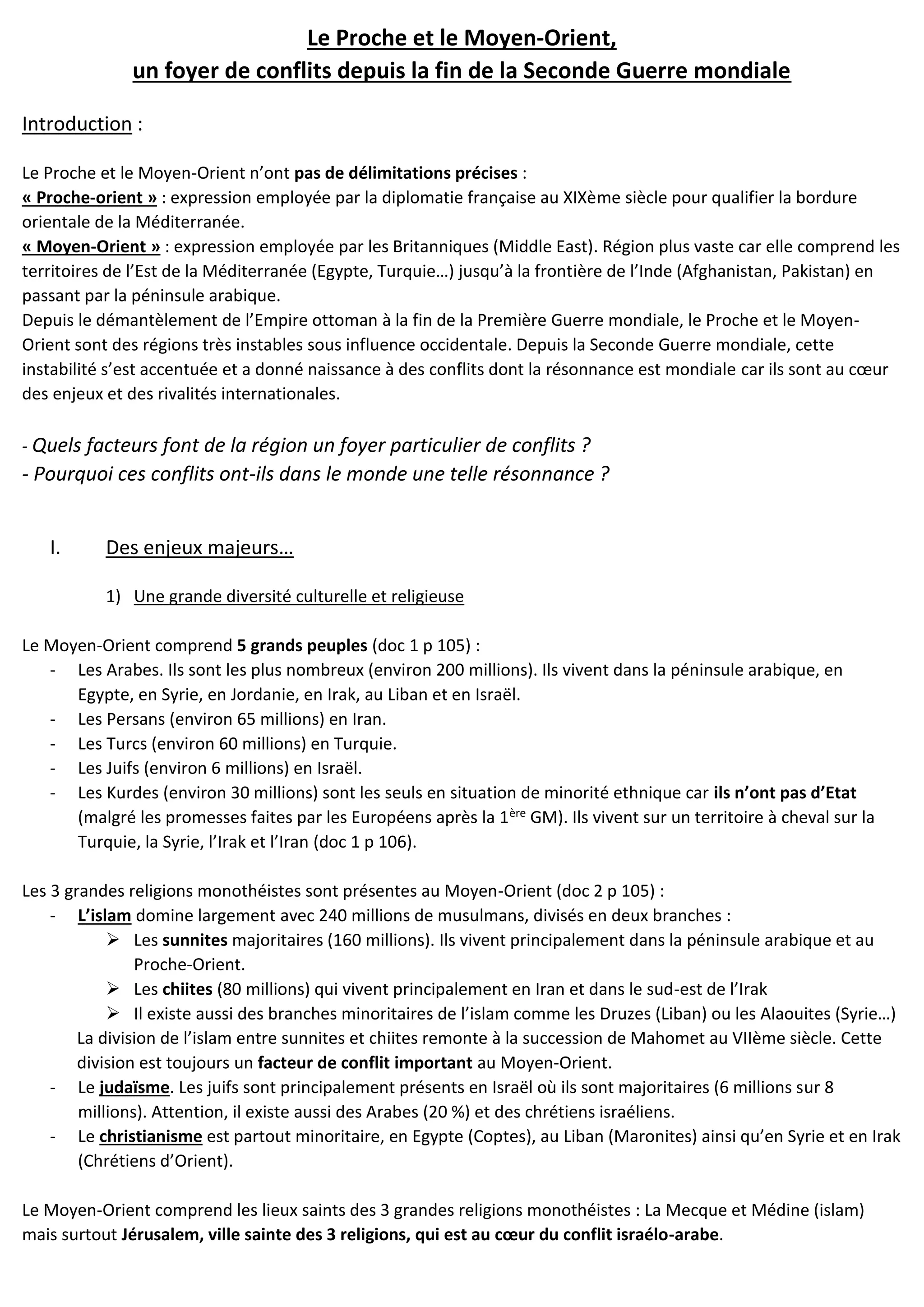 Le Proche et le Moyen-Orient, zones riches en ressources et culturellement diversifiées, sont des foyers de conflits depuis la fin de la Seconde Guerre mondiale, exacerbés par des rivalités internationales et des rivalités religieuses. Les conflits, tels que le conflit israélo-arabe et les rivalités d'influence entre les États-Unis et l'URSS, ont des répercussions mondiales en raison de l'importance géostratégique de la région. La quête de contrôle des ressources, notamment l'eau et le pétrole, ainsi que des questions politiques et territoriales, continuent d'alimenter des tensions et des conflits durables.