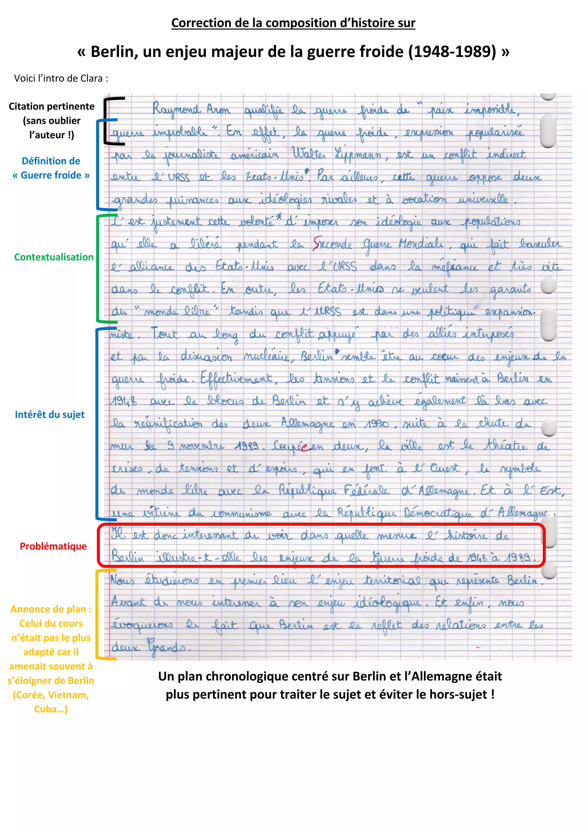 Le document corrige une composition d'histoire sur Berlin durant la guerre froide, en soulignant l'importance d'une approche chronologique centrée sur Berlin plutôt que sur des événements périphériques. Il mentionne un plan détaillé en deux parties proposé par Emma, tout en suggérant qu'un plan en trois parties aurait également été pertinent. Enfin, il souligne l'importance d'intégrer des éléments comme la réunification allemande de 1990 et la disparition de l'URSS en 1991 dans la synthèse.
