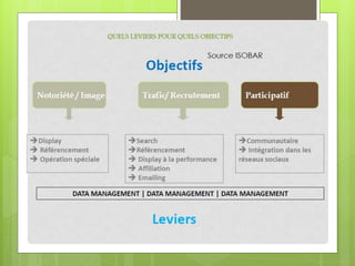 Le document présente un bilan de l'année 2011 sur le marché de la publicité en ligne, en se concentrant sur le SEO, SEM, et le display. Il détaille les performances des moteurs de recherche, les stratégies pour piloter des campagnes de liens sponsorisés, ainsi que le fonctionnement des réseaux publicitaires et des échanges d'annonces en temps réel. Enfin, il cite des exemples de campagnes marquantes, illustrant l'efficacité des techniques de ciblage et d'engagement des utilisateurs.